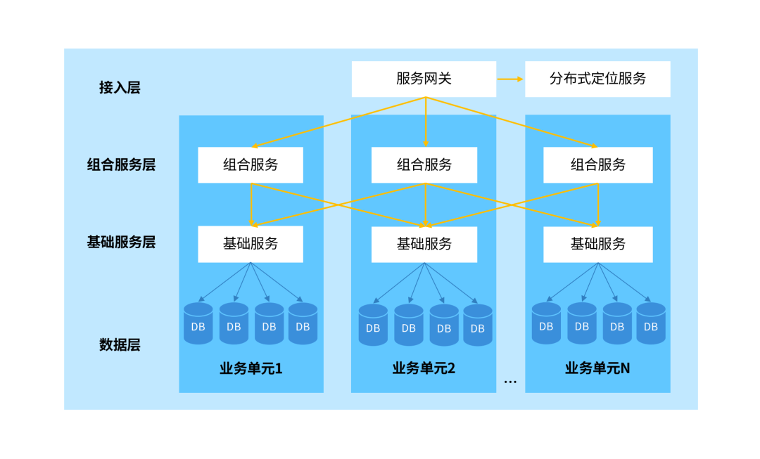 在介紹分布式定位服務之前,我們先介紹下單元化架構的概念,單元是指一個能完成某一類業務操作(如個人存款業務)的自包含集合,在這個集合中包含了業務所需的服務,以及分配給這個單元的客戶數據。單元作為部署的基本單位,通常會在在多個機房中容災部署,每個機房內單元數目不固定,任一單元均部署系統所需的全部應用,數據則是全量數據按照某種維度劃分后的一部分。