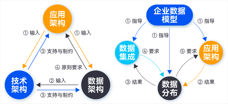 應用架構是數據架構的輸入。數據的分布是數據在業務應用與數據應用系統中的分布,這些系統的業務功能決定了將產生哪些數據以及需要哪些數據,因此,應用架構設計決定了數據的分布,指導數據架構中數據定義、數據集成與交互等規劃和管控工作。數據架構設計對應用架構的輸入不應照單全收,應用系統中的數據模型設計應遵循企業數據架構,數據分布與集成的原則要求影響應用系統的功能分布。