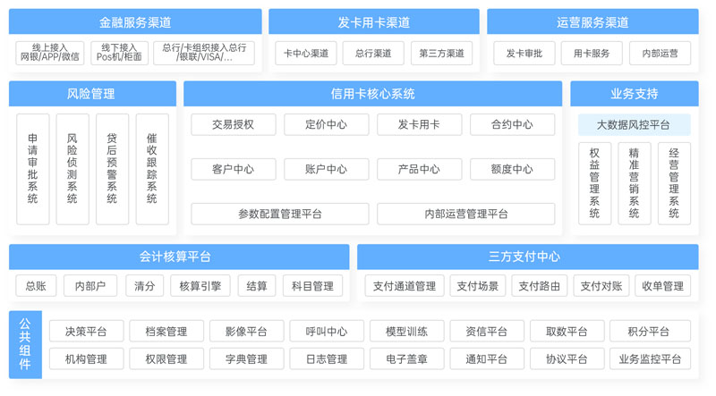 建立各種彼此獨立又互相協作的模塊化服務中心,如產品中心、定價中心、額度中心、授權中心、賬務中心、運營中心等,為信用 卡業務的快速、靈活、彈性、創新發展提供可能