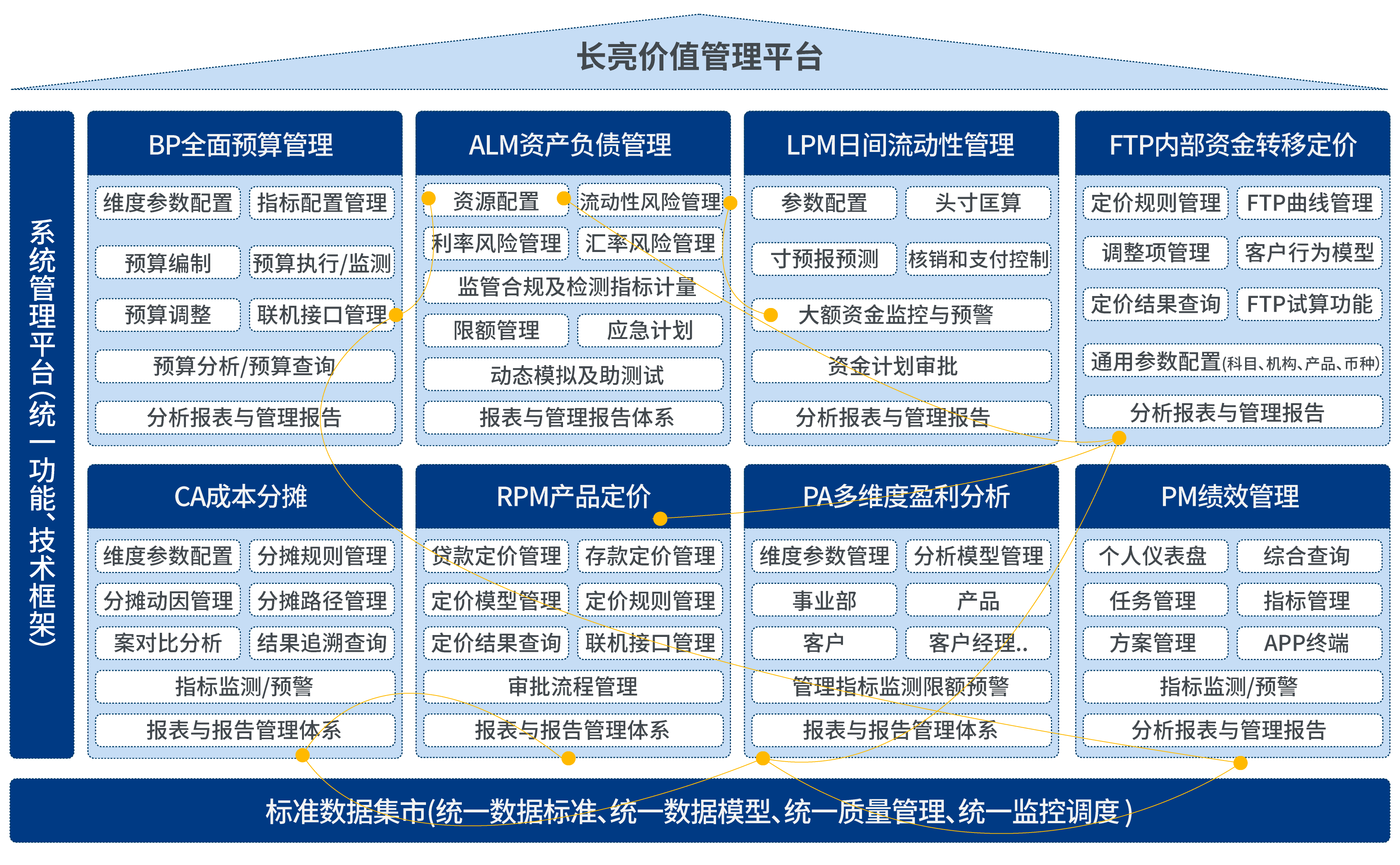 長亮科技全面價值管理解決方案將銀行經營和管理作為一個系統性的整體,通過“標準數據整合、產品功能聯通、管理應用協同、交互體驗優化”的一體化產品設計,形成“戰略-組織-流程-績效”的管理協同,徹底解決銀行面臨的孤島式管理信息系統的建設困局,持續幫助商業銀行構建具備銀行業特色的管理系統。