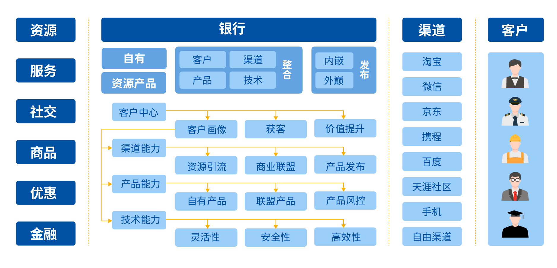 平臺通過對客戶體系、產品體系、渠道體系、營銷體系、風控體系的層層解偶,解決了互聯網金融產品、客戶、渠道靈活多變的市場需求,可以配置化實現產品設計、客戶分析、渠道擴展、營銷及風控策略定制。
