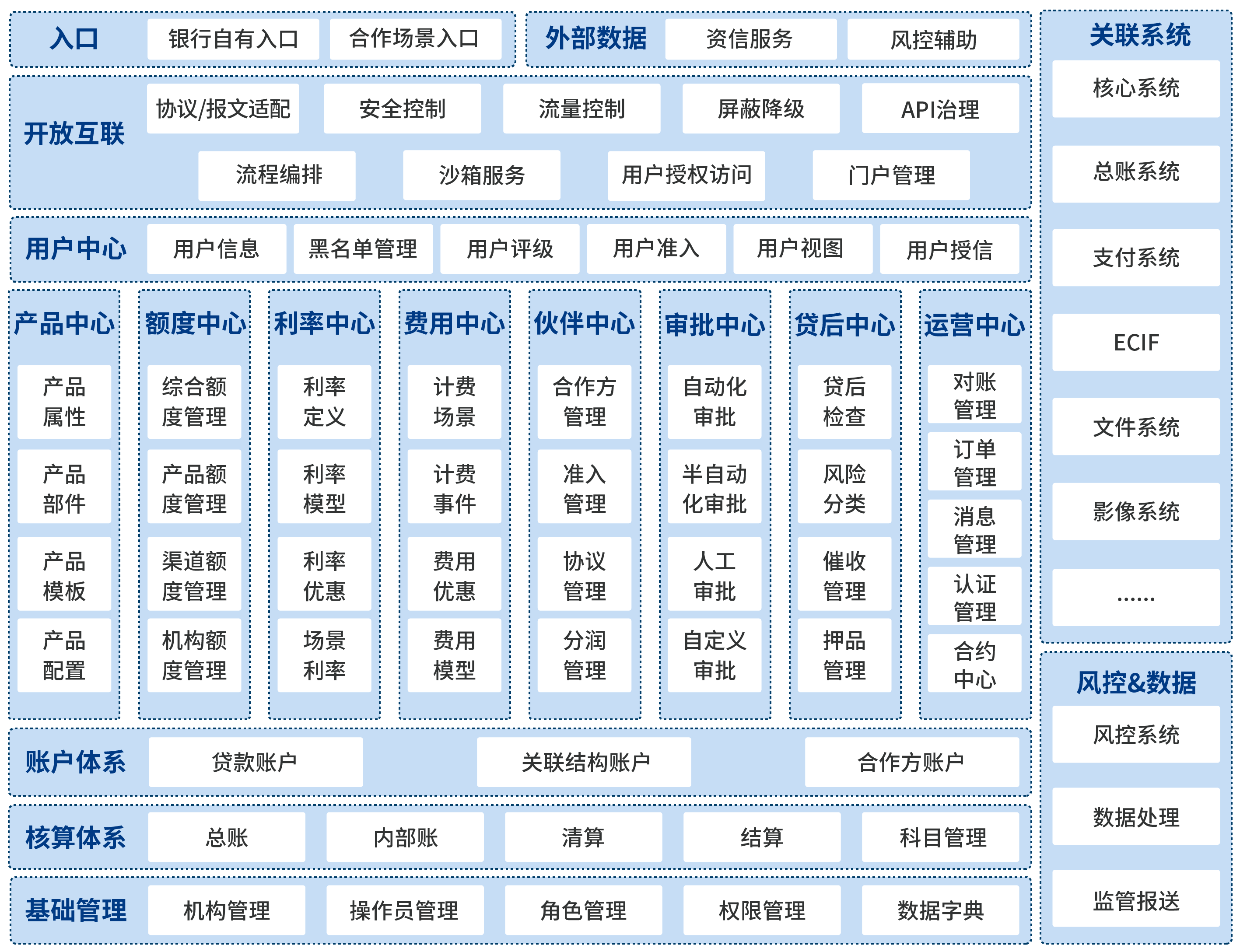 支持引入渠道合作方和消費(fèi)融資類場景,打造客戶和商戶的快速融資產(chǎn)品。基于交易信息和商圈的“信用評(píng)價(jià)體系”,通過接入大數(shù)據(jù)實(shí)現(xiàn)自動(dòng)授信、在線營銷、快速融資&風(fēng)控&放貸,隨時(shí)隨地為客戶提供全面的融資服務(wù)。