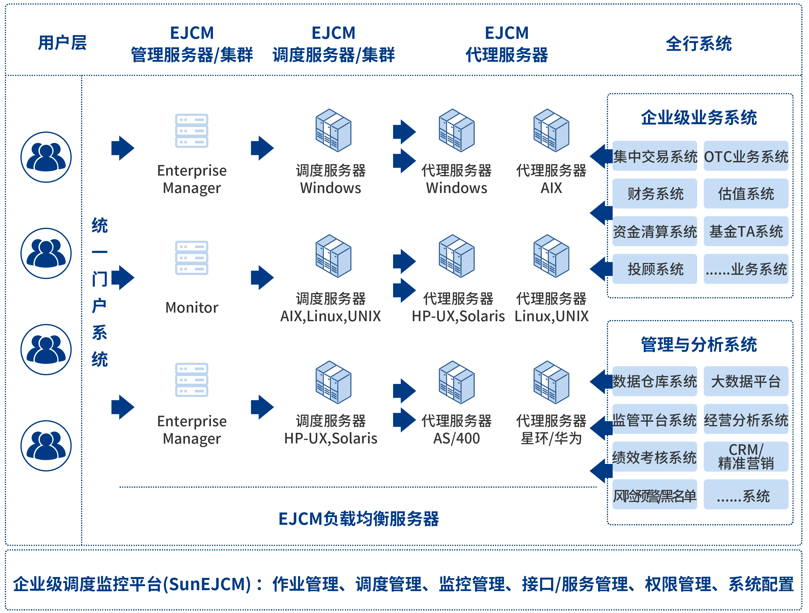 定位于證券公司內應用系統批量任務的總體調度與實時監控,支持多平臺跨應用,貫穿企業的批量任務線,將業務系統、渠道系統、管理系統、大數據系統的所有批量任務進行統一集中管理,通過任務間的依賴關系融為一體,具備跑批任務觸發、跑批任務狀態監控、跑批任務日志展示、運行性能監控、故障報警等功能。